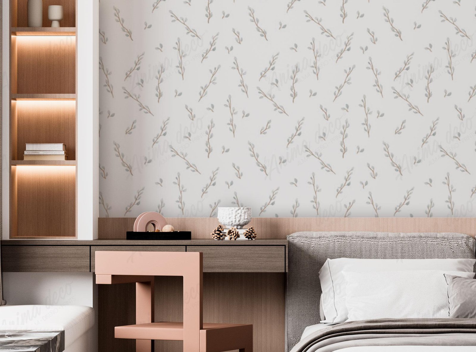 *Las imágenes son ilustrativas: el patrón se repite cada 1m y se presentan en paños de 52cm de ancho por el alto de tu pared (por ej. la foto 2 simula una pared de 4.5x3m). Los tonos digitales respecto de los impresos pueden diferir según la calibración de cada pantalla.